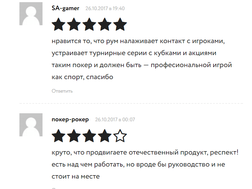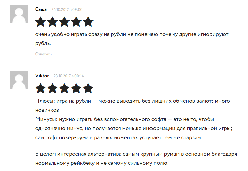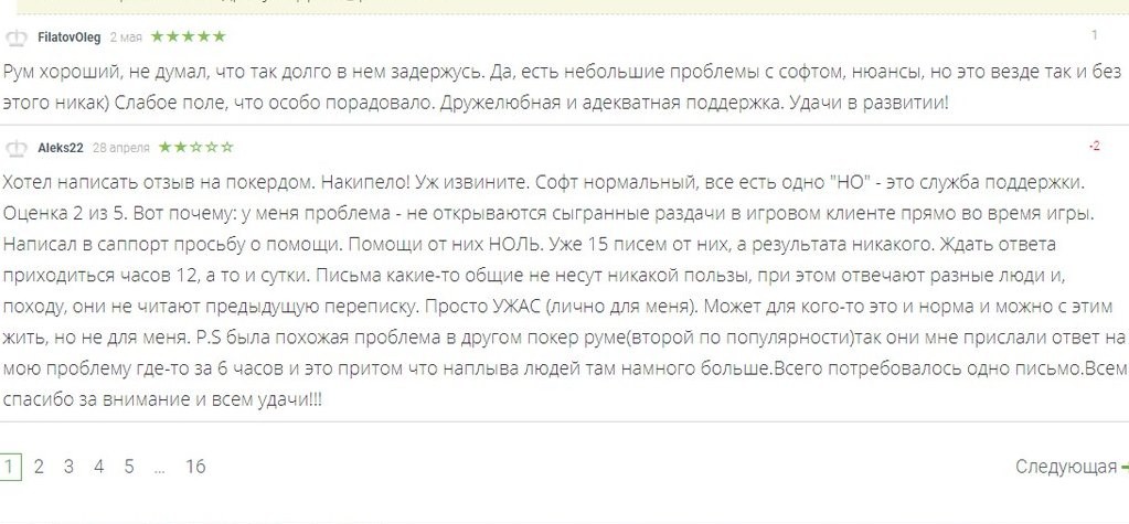 Нравится пользователям и система рейк-бека, однако отыгрыш бонуса за первое пополнение у некоторых игроков, вызывает возмущение, несмотря на то, что подобные условия практикуют почти все покерные сайты.