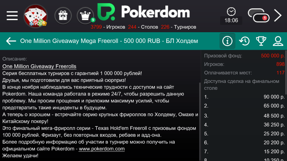Отдельные фрироллы оператор регулярно устраивает для подписчиков Телеграм и пользователей из Казахстана. Состязания с бесплатным участием составляют большую часть турнирной сетки в покер руме.